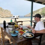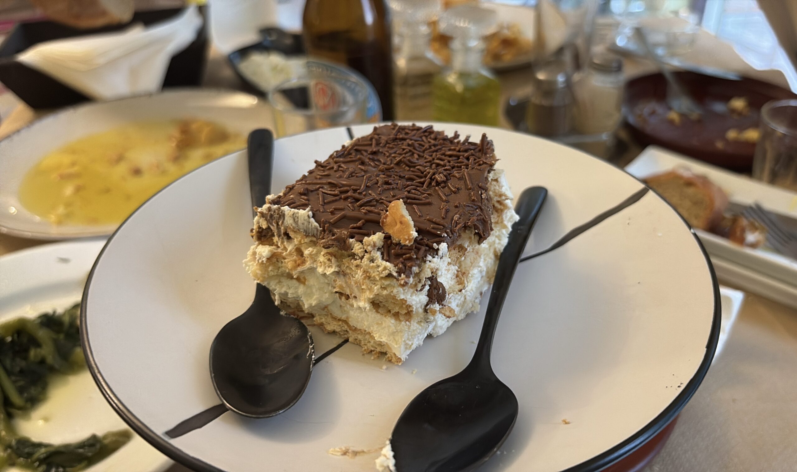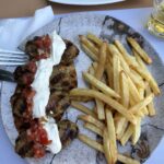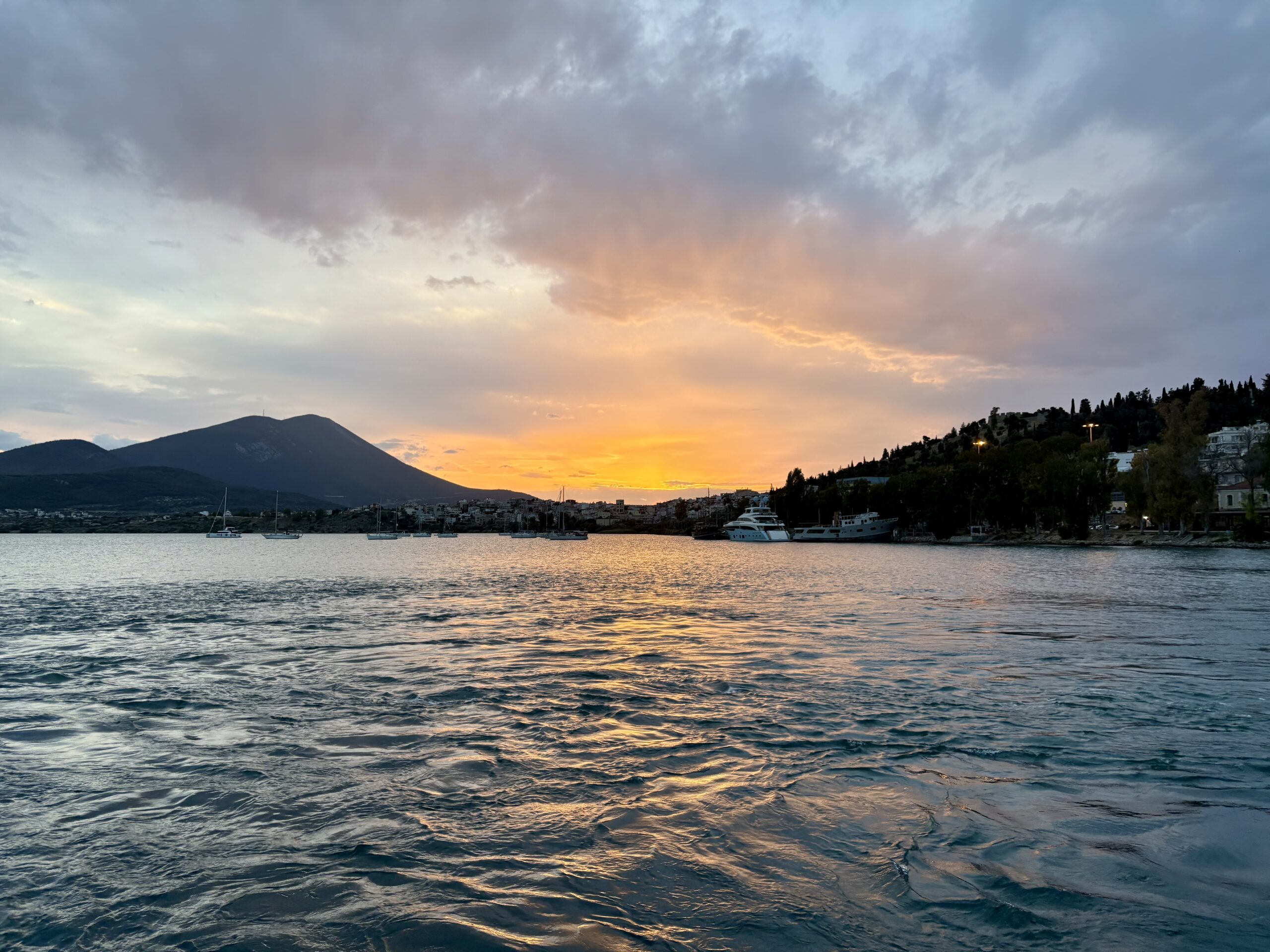 Nach dieser tollen Auszeit – übrigens, ich schreibe mal wieder, wir haben August… Aber heute ist ja erstmal der 09.-10.05 – fahren wir zurück Richtung Festland und planen eine Übernachtung in der Stadt Eretria (GR) am Milos Camping. Dort angekommen suchen wir uns einen schönen Platz aus, etwas weiter hinten abseits des Trubels. Wir richten uns ein, machen alles fertig und laufen teils am Wasser, teils an der Hauptstraße zum Ort selber. Wir suchen eine schöne Promenade. Vom Betreiber haben wir gehört, dass Eretria (GR) eine der schönsten Städte auf Evia sein soll. Wir können es nicht unbedingt bestätigen. Es ist dennoch ein schöner Spaziergang. Die Promenade ist etwas in die Jahre gekommen. Eine Mischung aus Leerständen und Restaurants, die jeweils Platz für gefühlt 200 Personen haben, davon dann 10 Stück. Auslastung lag zu dem Zeitpunkt bei 1 % und leider sind auf derselben Straße die ganze Zeit Autos 1 Meter neben einem hergefahren. Für den Abend habe ich über Maps ein nettes Restaurant gefunden. Etwas abseits der Straße haben wir es dann auch gefunden, es hatte offen, aber wir waren die Einzigen. Let’s give it a try. Wir setzen uns hin, werden von der augenscheinlichen Besitzerin begrüßt. Sie gab mir ein paar Oma-Vibes, ca. um die 65, herzlich und wohlgenährt. Wir bekommen einen Zettel, auf dem steht: „Herzlich willkommen in meinem Restaurant. Ich koche seit 30 Jahren und mache es mit Leidenschaft. Ich bitte Sie, mir zu vertrauen. Hier gibt es keine Speisekarte. Es gibt das zu essen, was ich heute gekocht habe. Ich freue mich, für Sie das Essen zuzubereiten. Wenn Sie vegetarisch oder vegan sind, sagen Sie bitte Bescheid.“