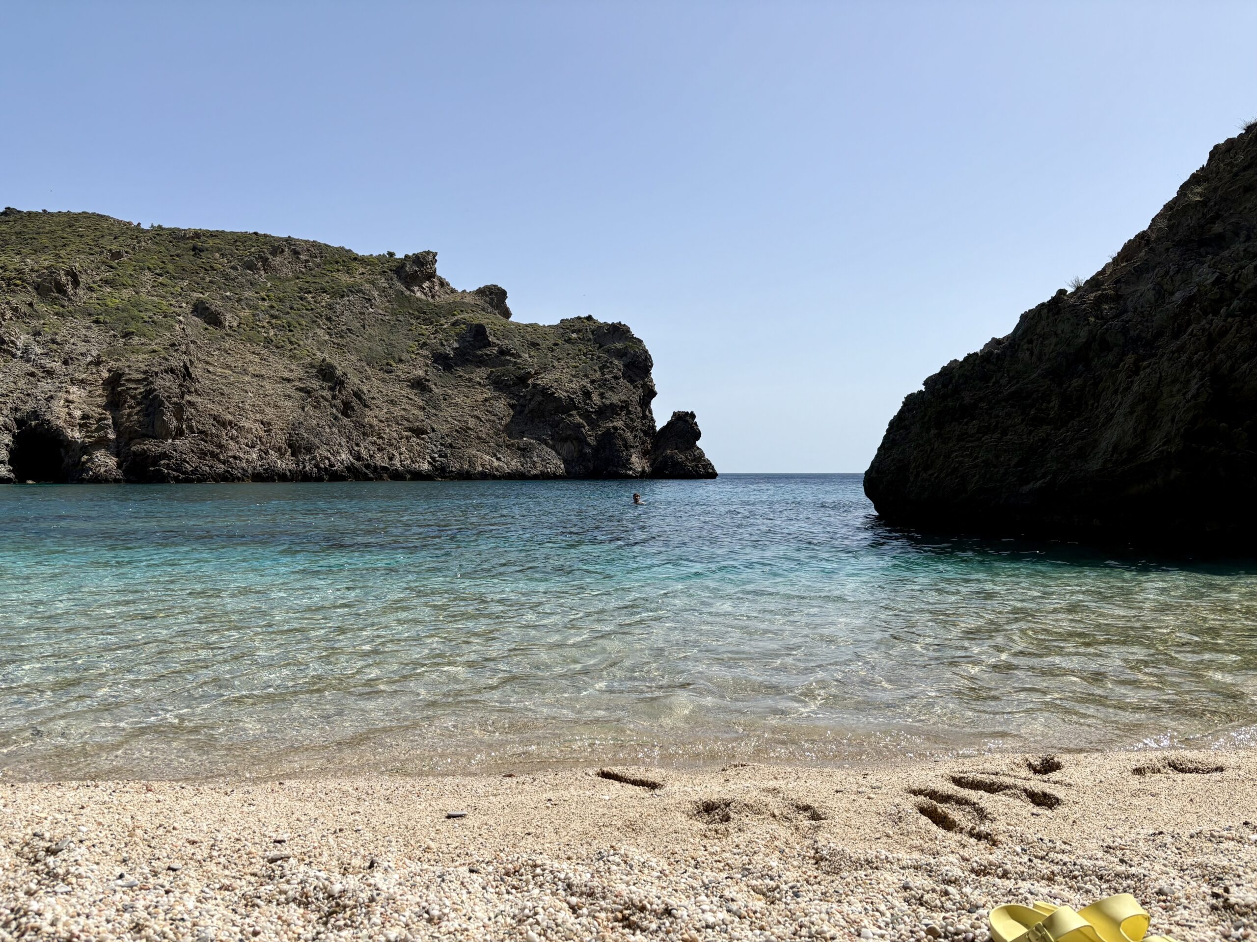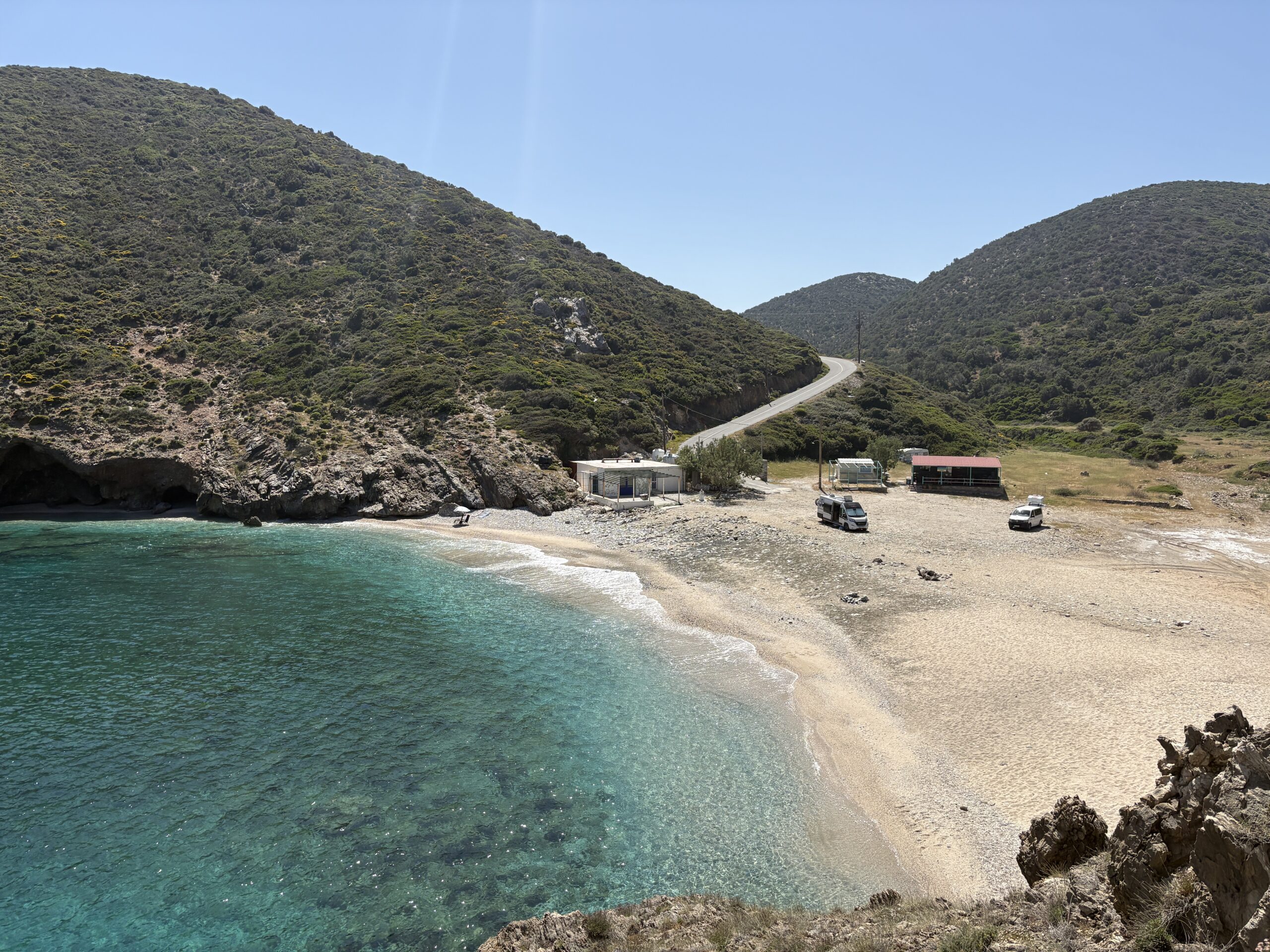 Wir verlassen die Großstadt (05.-08.05), den Trubel sowie den Tourismus Richtung Evia (GR). Dies ist zum einen Heimat der Griechen, wenn sie Urlaub machen, und zum anderen das unbekannte schöne Griechenland – die zweitgrößte Insel des Landes nach Kreta. Dort haben wir einen schönen Stellplatz ausgemacht in einer einsamen Bucht mit einer guten Taverne, wenn dem Internet Glauben zu schenken ist. Dauer der Fahrt sind ca. 2 Stunden. Sina fährt und ich schreibe an meinen Berichten, als wir plötzlich am Seitenrand stehen bleiben. Ich schreibe noch kurz, bis ich hochschaue und Sina mich mit großen Augen und blassem Gesicht anschaut. Sie fragt: „Hast du das Quietschen gerade gehört?“ – „Ja“, sage ich, habe mir aber nichts dabei gedacht. „Ich glaube, da ist gerade ein Auto hinter uns in den Graben gefahren“, sagt Sina. Ich steige aus, um nachzuschauen. Tatsächlich steht da ein Auto ca. 15 Meter von der Straße entfernt im Feld hinter dem Graben. Ein jüngerer Mann steigt aus mit dem Wort „Efcharistó“. So gut ist mein Griechisch mittlerweile, dass ich es verstehe und weiß, dass es „Danke“ oder „Gerne geschehen“ heißt. Ich bin irritiert und frage auf Englisch, ob ich helfen kann und ob es ihm gut geht. Er antwortet nicht. Ich fasse es kurz: Es kommt noch ein Anwohner, bei dem ich das Gefühl hatte, dass er uns nichts Gutes wollte, und der Besitzer des Autos wollte die Polizei rufen – wohl, um uns eine Schuld/Teilschuld anzulasten. Wir wollten an dieser Stelle der Straße drehen, er dachte wohl, weil wir so langsam fuhren, dass wir hier rechts abbiegen, und nicht nach links zum Drehen ansetzen. Er wollte uns überholen, musste und hat dankenswerterweise auch nach rechts gezogen, um nicht in unsere Seite zu fahren, und ist ins Feld gefahren. Grundsätzliches Problem: Auch in kleinen Ortschaften wie dieser ist 50 km/h statt 90 km/h, aber das lohnt sich für 90 % der Fahrer nicht. Die Polizei kommt, ich habe zum Glück Fotos gemacht und einen netten Übersetzer, der noch dazugekommen ist, und wir dürfen dann ohne Probleme und zu Recht frei von Schuld weiterfahren. Das ist nochmal ein Wachrütteln, wie schnell es gehen kann. Wir fahren nach 5 Minuten nochmal rechts ran, ich brauche eine Zigarette, und kommen dann gegen Nachmittag sicher an unserer schönen Bucht an. Es ist traumhaft schön und wir sind die Einzigen. Das ist genau das Richtige jetzt, um den Trubel und das Geschehen des Tages fallen zu lassen und sich zu erholen. Wir bleiben hier bis zum 08.05 und haben eine wundervolle Zeit. Wir sind bis auf ein anderes Pärchen mit ihrem Womo alleine, essen mittags in der Taverne, die sonst nicht besucht wurde in dem Zeitraum. Das Essen ist sehr gut, ich kann es gut arbeiten, und jetzt, wo ich so daran denke, hätten wir noch länger bleiben sollen. Es war etwas Besonderes, dort so sein zu dürfen mit dem Bulli. Ein wirklich einzigartiger Ort bis hierhin. Καληνύχτα