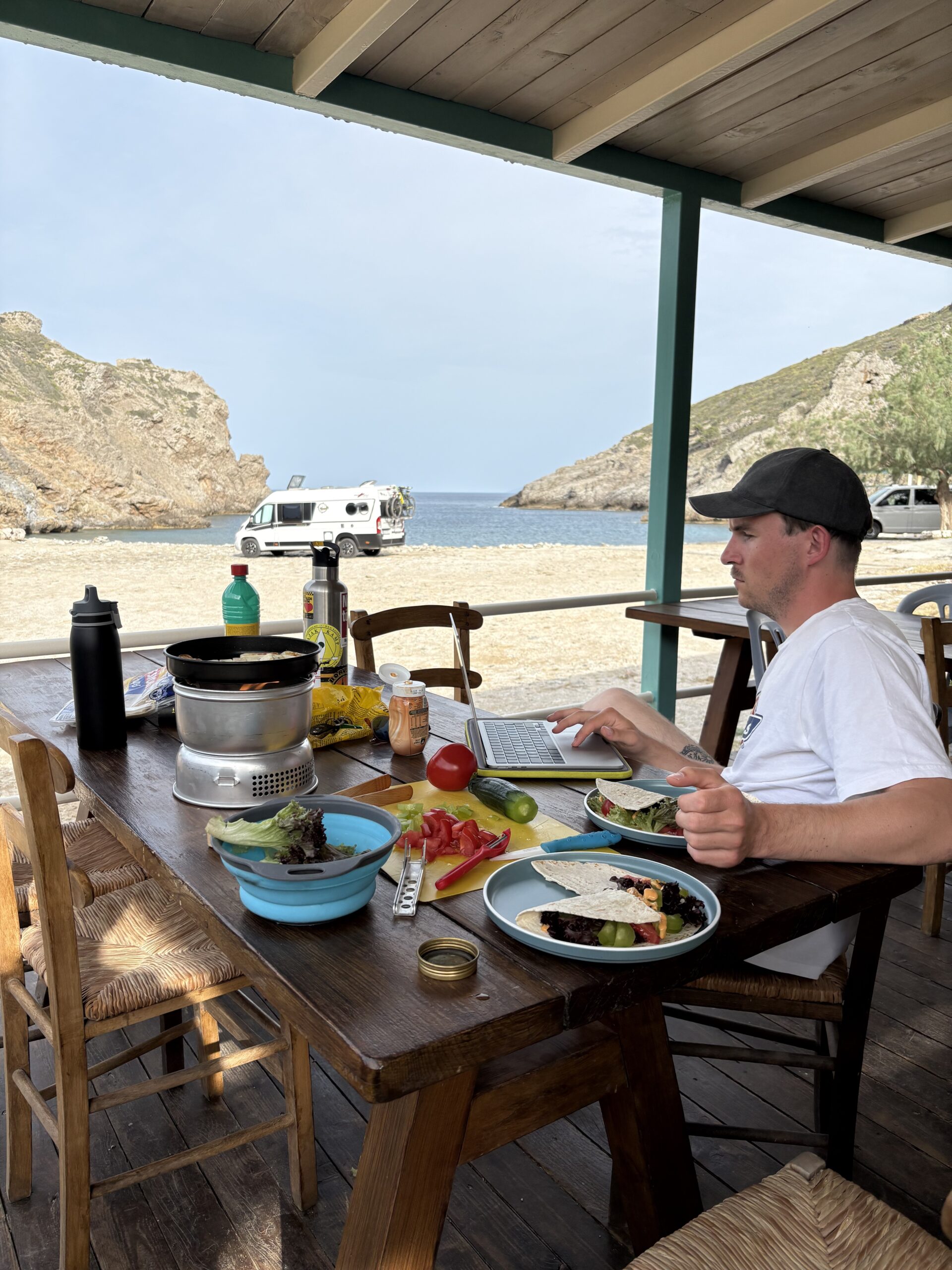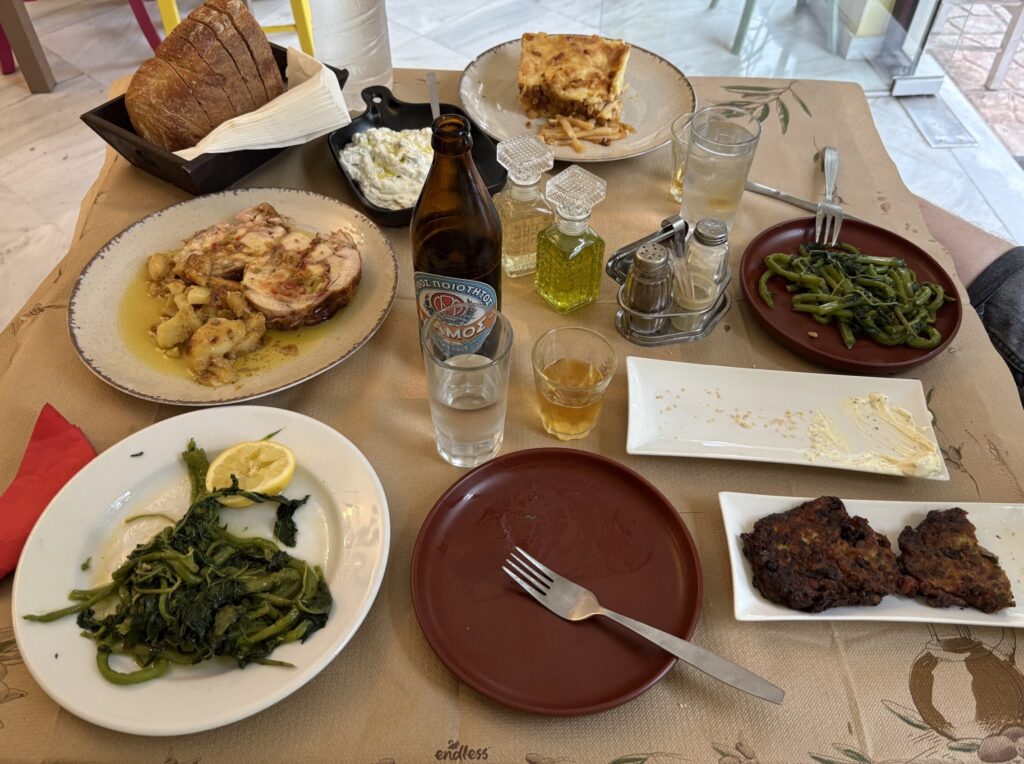 Das kam unerwartet. Aber wir lassen uns gerne überraschen und sagen, dass wir keine Einschränkungen haben. Wir bekommen einiges auf den Tisch. Von Fleisch über Gemüse, Dinge, die uns bekannt sind, eine Art Spinatsalat, der auf Nachfrage keiner ist. Was es ist, bekommen wir aber nicht raus. Das gibt es wohl nur in Griechenland und ist etwas Saisonales und Lokales. Wir haben ein tolles Essen, platzen fast, als wir bezahlen, und rollen in aller Ruhe wieder zurück zum Bulli. Für das Essen mit Getränken, Vor-, Haupt- und Nachspeise für 2 Personen bezahlen wir 38 €, natürlich exkl. Trinkgeld. Am nächsten Tag passiert nicht viel, wir gehen einkaufen und finden einen neuen tollen Käse. Eine Alternative zum Comté-Käse: den Graviera-Käse. Sehr gut! Wir waschen noch eine Maschine Wäsche und damit war der Tag dann auch um. Καληνύχτα