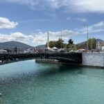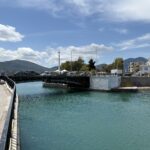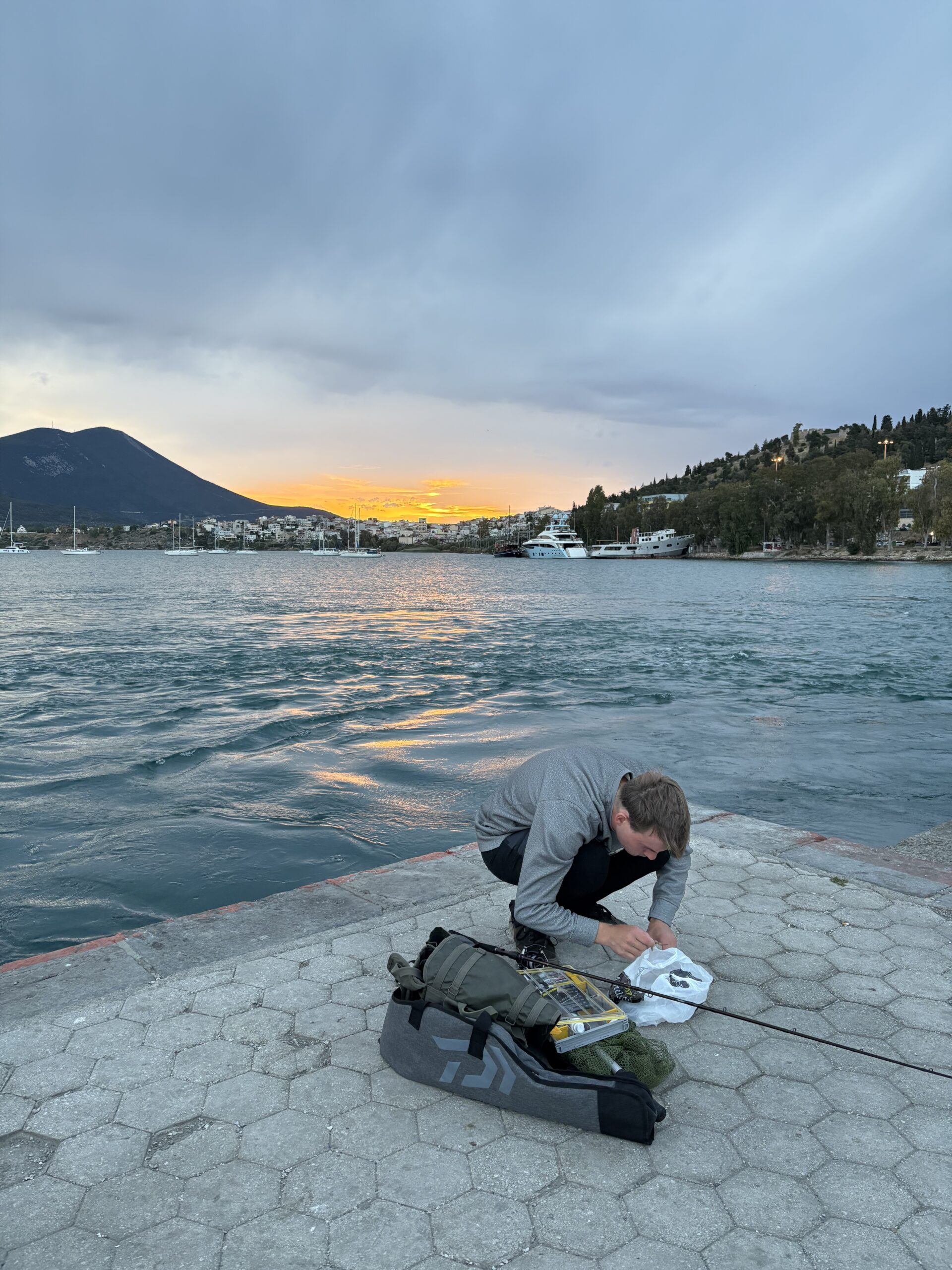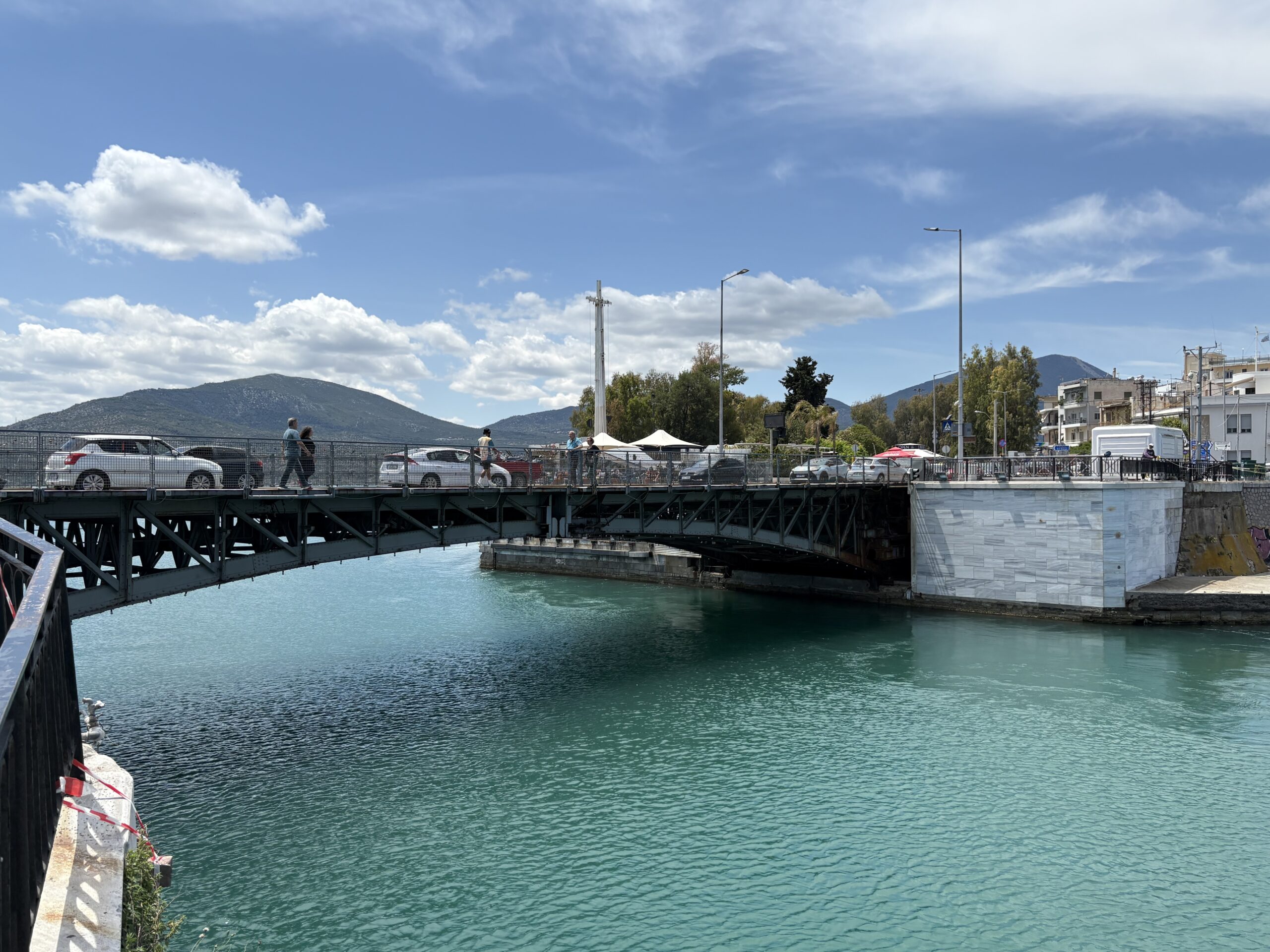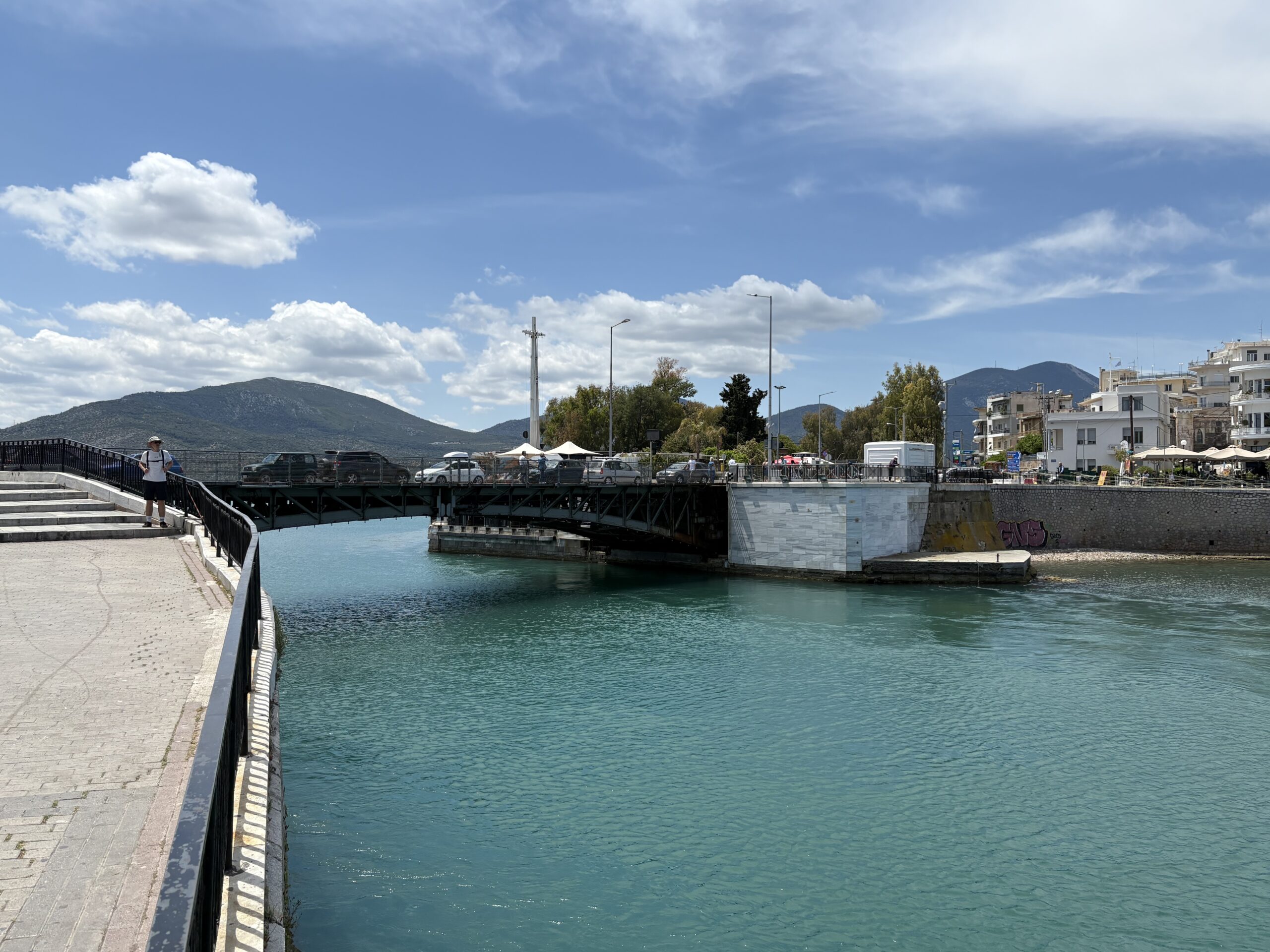 Wir brechen auf zu einem Naturschauspiel, das wohl einmalig auf der Welt ist und an dem auch Aristoteles verzweifelt ist. 11.05: Wir fahren eine Stunde entlang der Küste, sehen noch ein von Flugzeugen in den Himmel gemaltes Herz und kommen nach kurzer entspannter Fahrt am Grenzpunkt der Insel Evia/Euböa und dem Festland an. Der so unscheinbare, aber auch bekannte Ort ist Chalkida (GR). Wir finden einen netten Platz auf einem Parkplatz, direkt am Wasser gelegen, mit uns sind noch 2 weitere Camper da. Da wir direkt die Stadt erkunden wollen und das einmalige Schauspiel in natura erleben möchten, verlieren wir nicht viel Zeit. Solarpanel aufs Dach, Sitzbank drehen und ab geht’s. Auf den ersten, fast auch auf den zweiten Blick merkt man nicht, was dort Einzigartiges vor sich geht. Hätte Sina dies nicht recherchiert, wäre es mir wohl verborgen geblieben. Hier jetzt aber endlich die Erklärung: In Chalkida, an der schmalen Euriposstraße zwischen Evia/Euböa und dem griechischen Festland, kehrt sich die Strömung des Wassers mehrmals täglich auf spektakuläre Weise um. Dieses seltene Naturphänomen ist weltweit einzigartig und fasziniert seit der Antike Gelehrte und Besucher gleichermaßen. Danach schauen wir ein paar Anglern beim Fischen zu und bekommen Hunger. Wir gehen in ein kleines Restaurant (MEZENOTWAEÍO OpTavoía) etwas bergauf und essen ein super leckeres Fladenbrot mit mixed minced meat. Das war wirklich lecker. Weil es dort so warm ist, muss eine Abkühlung her. Dank der Firma Wallmeyer, die mich mit dieser Köstlichkeit vertraut gemacht hat, finde ich ein nettes Lokal, in dem es den feinen Tropfen aus der Flasche der Kellerei von Veuve Clicquot gibt. Da ich mit Sina noch gar nicht richtig auf ihr Studium angestoßen habe, bleibt mir ja fast nichts anderes übrig. Wir bekommen für 6 € pro Glas, was ein guter Preis ist, ein warmes Glas. Aber egal, in erster Linie soll es ja auch helfen und nicht nur schmecken. Wir sitzen dort gemütlich, ein bisschen Wind weht und wir trinken danach noch einen Cocktail. Wir entscheiden, noch meine Angelsachen zu holen, um beim Sonnenuntergang die Atmosphäre zu genießen und lassen den schönen Tag so in Ruhe ausklingen. Καληνύχτα